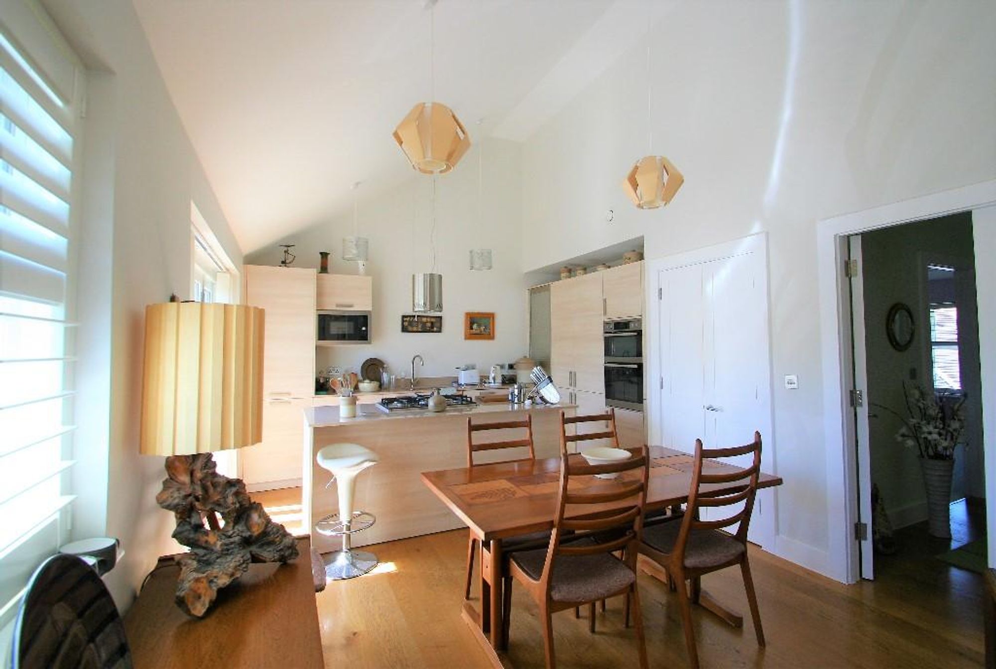 Upon entering, you are welcomed by an impressive open plan living space, featuring high vaulted ceilings that create a sense of light and airiness throughout.